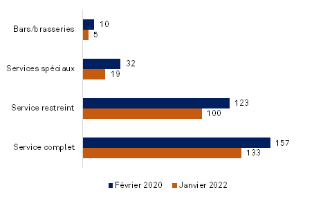 Du côté de l’Enquête sur les postes vacants et les salaires (EPVS), sur les 4 240 postes vacants au 4e trimestre 2021, tous secteurs confondus, 560 concernaient le secteur de la restauration, soit 13 % de l’ensemble des postes vacants, mais le tiers de ceux du secteur de la vente et des services. L’Enquête précise qu’environ 130 postes vacants requéraient des cuisinières et cuisiniers et 430, des serveuses et serveurs au comptoir et des aides de cuisine. Il appert aussi que la pression sur le recrutement s’est accrue au cours des derniers trimestres, avec des volumes de postes vacants ayant doublé pour certains métiers. La grande majorité des postes vacants – plus de 9 sur 10 – sont en recrutement constant.