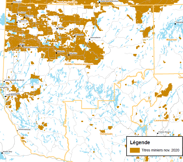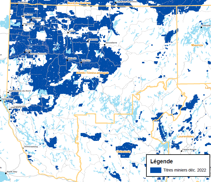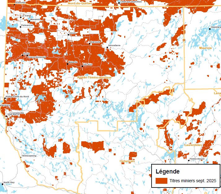 Titres miniers en Abitibi-Témiscamingue, 2020, 2022 et 2025