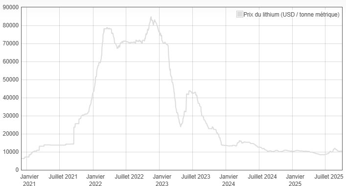 Prix du carbonate de lithium, en dollar américain par tonne métrique, période de cinq ans