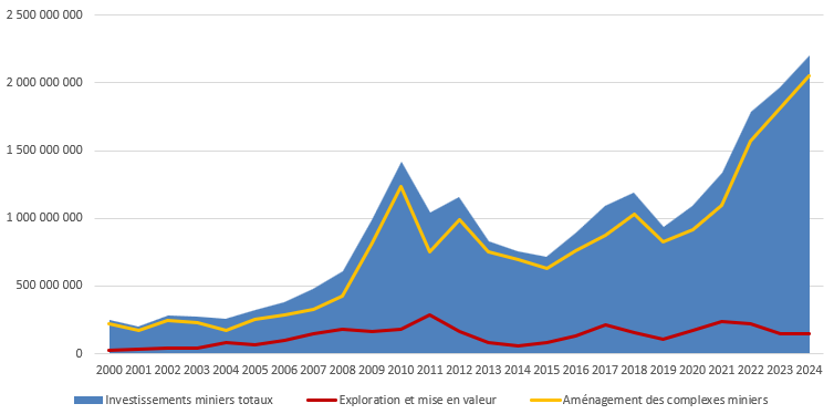 La majorité des investissements (93 %) sont associés à l’aménagement de complexes miniers, que ce soit pour des travaux sur un site minier en production ou pour maintenir ou augmenter les réserves de minerai.