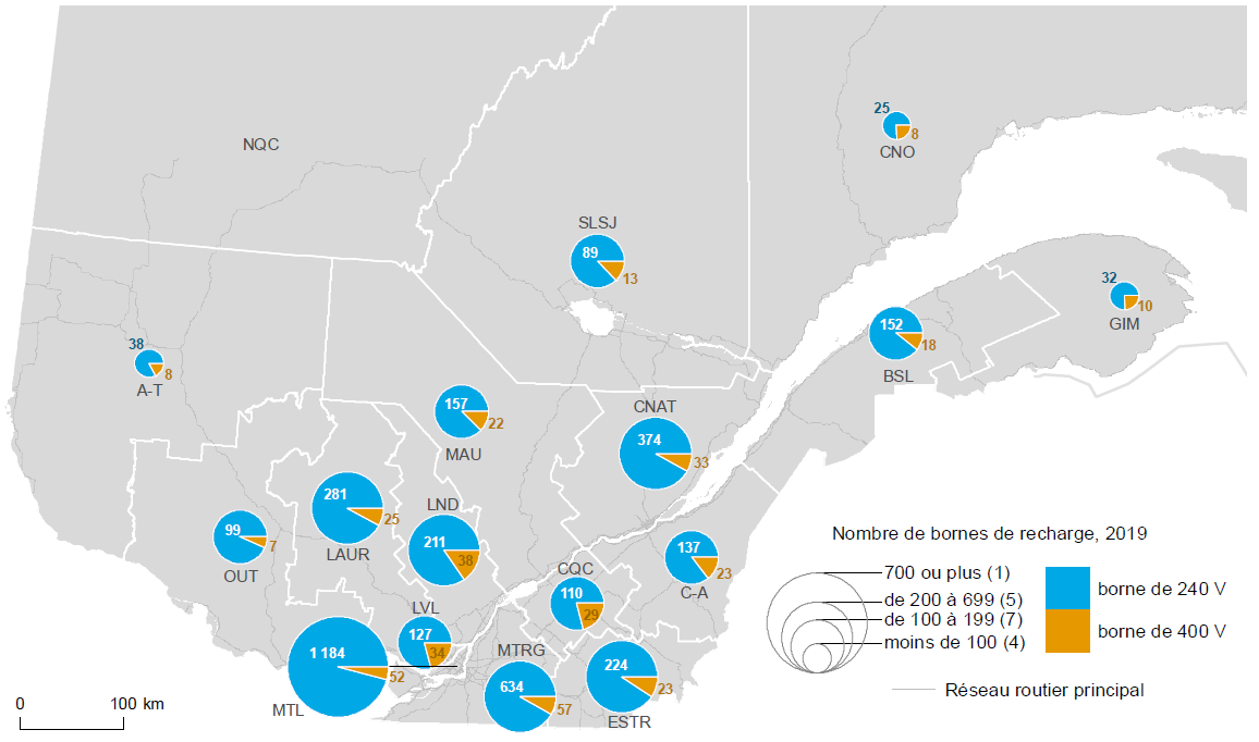 Sources : Mogile Technologies inc. (mogiletech.com) (données sur les bornes). Ministère de l’Énergie et des Ressources naturelles, Système sur les découpages administratifs, janvier 2016 (données sur l’hydrographie et les limites administratives). Compilation de l’Institut de la statistique du Québec. Carte tirée de l’Institut de la statistique du Québec, Panorama des régions – Édition 2019, 2019.
