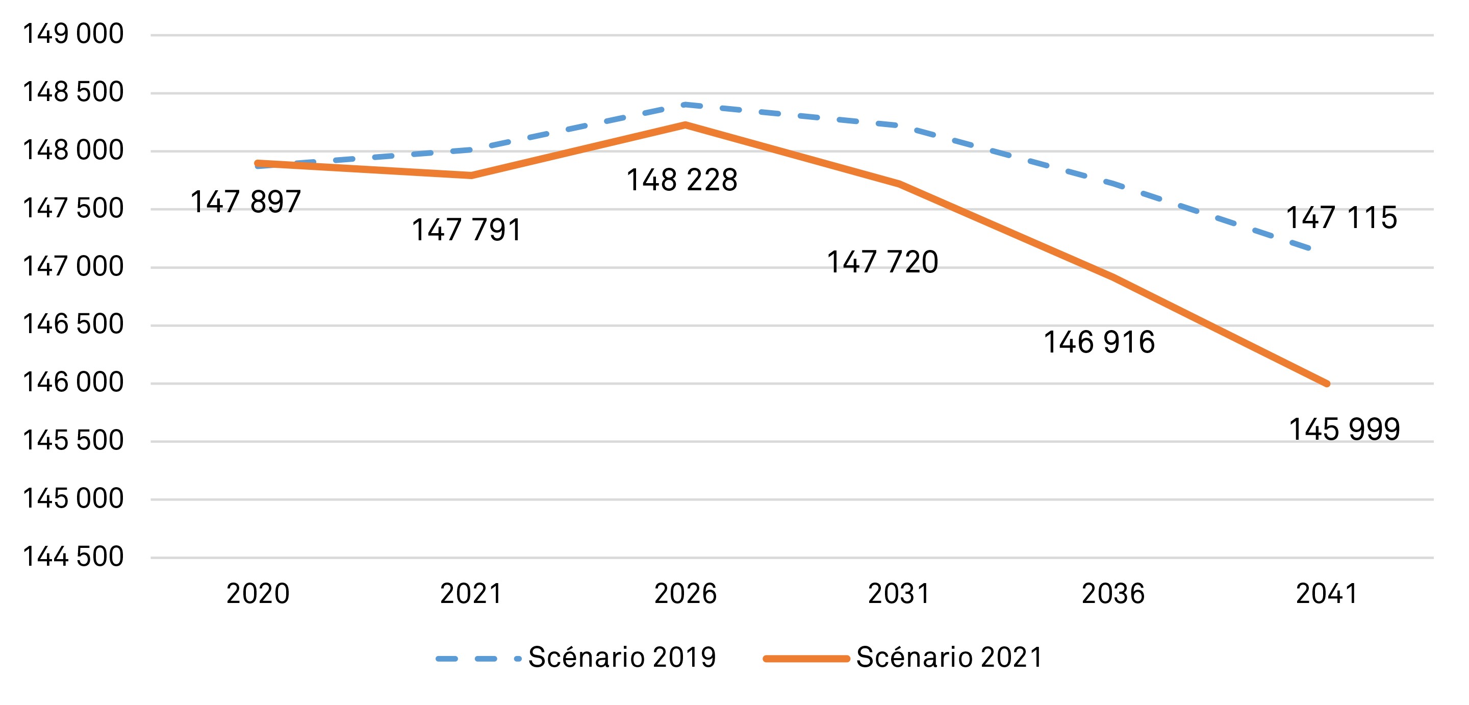 Le graphique ci-dessous illustre l’évolution de la population à court, moyen et long terme. À la lumière des tendances passées et récentes relatives à la fécondité, à la mortalité et à la migration (tous types confondus), la population accuserait un très léger recul au 1er juillet 2021. Par la suite, elle renouerait avec la croissance, bien que de très faible amplitude, jusqu’en 2026. Dès lors, une tendance à la décroissance s’amorcerait et se poursuivrait jusqu’en 2041, tel que le présageait le scénario de 2019.