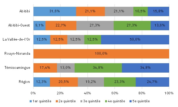 La Ville de Rouyn-Noranda et la MRC de Témiscamingue ne comptent aucune localité se trouvant au premier quintile, alors que la MRC d’Abitibi en compte 6, représentant le tiers de ses localités, où vit 22 % de la population du territoire.